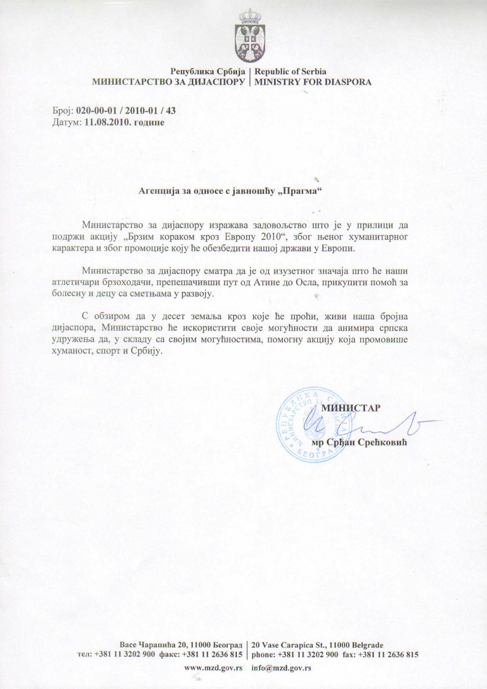 Ambasador Bosne i Hercegovine u Srbiji i Crnoj Gori, njegova ekselencija gospodin Tomislav Leko, sa delegacijom ambasade posetio je opštinu Šabac. Na prijemu kod gradonačelnika Miloša Miloševica obavljeni su razgovori sa predstavnicima najuspešnijih šabačkih firmi. Delegacija je posetila Mlekaru Šabac (klijent agencije "Pragma"), Zorka-pharmu, šabačku Biblioteku i TV Šabac.